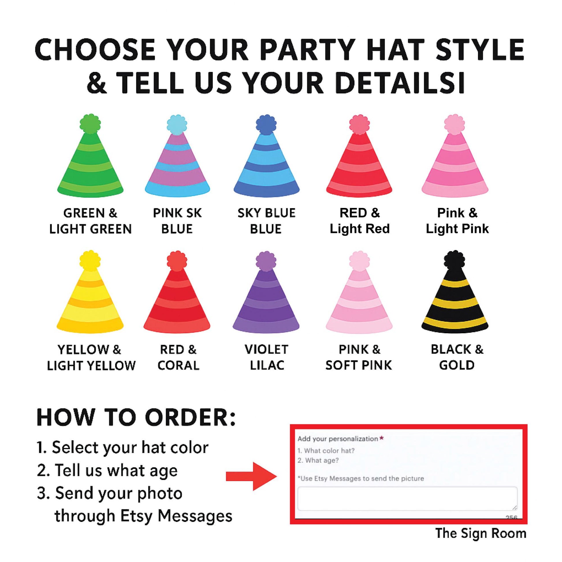 Each banner includes 8 custom heads wearing a birthday hat in your chosen color, and we can add the age or leave it off-your choice!